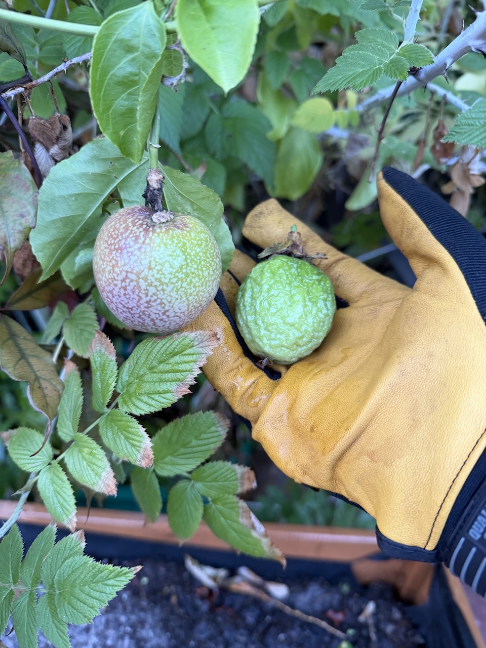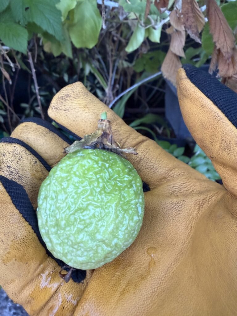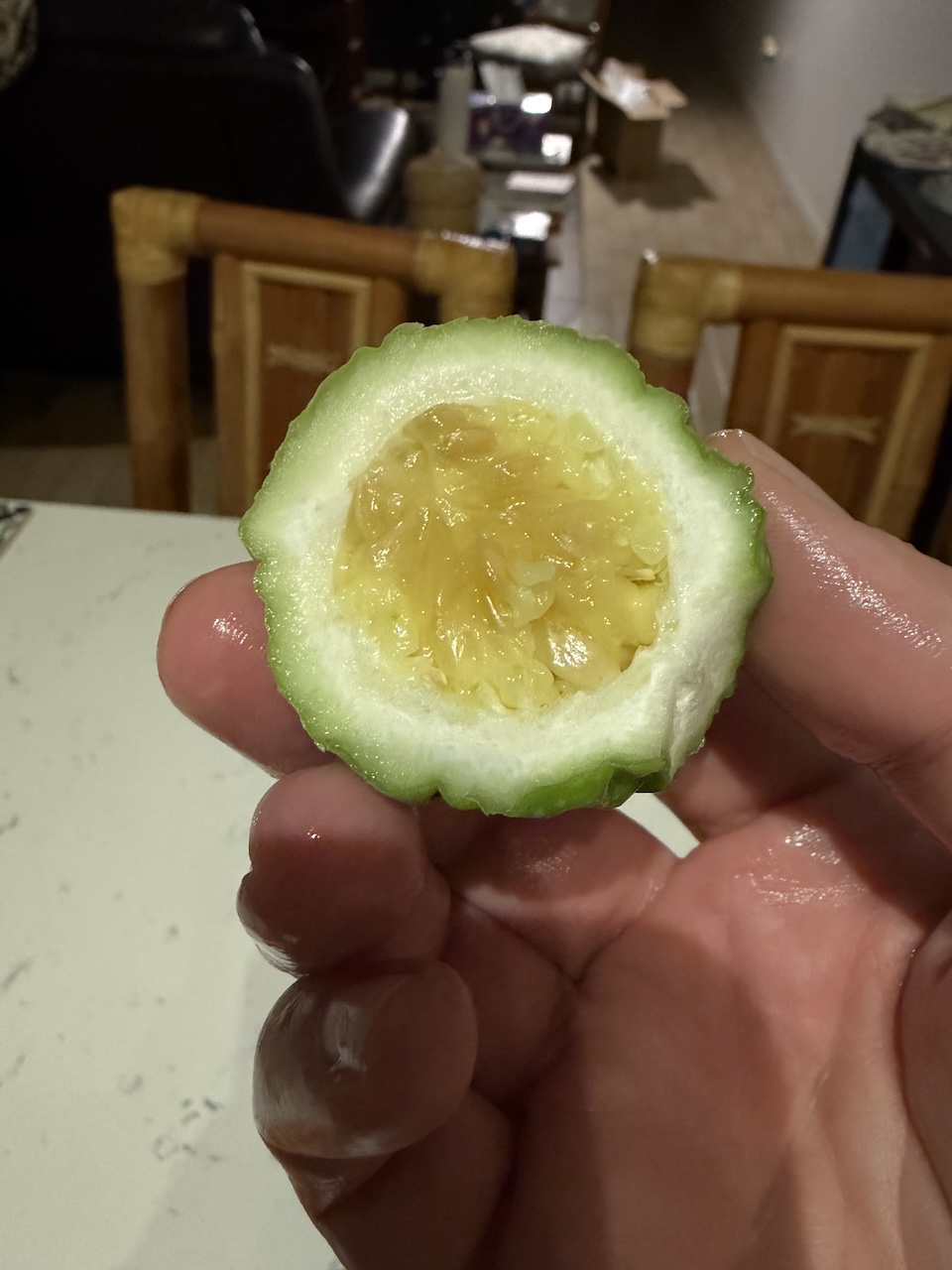 The temperatures in Florida recently dropped to about 40 degrees and then in the 50s for a few days in a row. Remember those seven passion fruits I mentioned? Unfortunately, I lost about half of my crop because it got too cold. One of them got all wrinkly but stayed green. I tasted it, and it was very sour and bitter.
